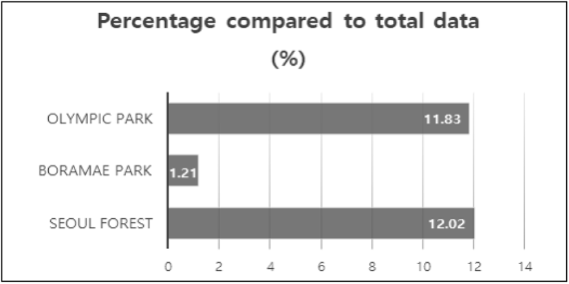또한, 구글맵리뷰의 특성 중 하나는 전 세계의 사람들이 자유롭게 리뷰를 작성할 수 있고, 원문과 번역된 내용이 함께 제공된다는 점이다. 연구에서는 번역되어서 제공되는 리뷰를 외국인이 작성한 글이라고 판단하고 추출 및 분석하였다. Figure 3은 외국인 리뷰 데이터의 비율이며, 외국인 평가 비율은 서울숲 12.02%(409개), 올림픽공원 11.83%(204개)로 전체 데이터의 약 10% 비율을 차지하였다. 반면, 보라매공원은 지역 주민의 이용이 많으며, 외국인 평가 비율도 1.21%로 매우 낮게 나타났다.