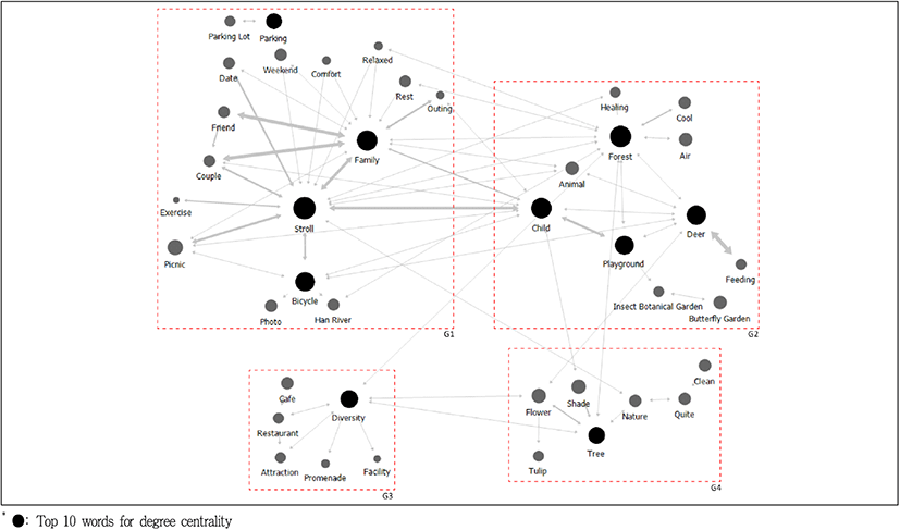 서울숲은 Table 4를 보면 ‘산책’, ‘숲’, ‘가족’, ‘아이’, ‘사슴’, ‘자전거’, ‘놀이터’, ‘다양’, ‘나무’, ‘주차’ 등의 키워드가 높은 중심성 값을 가진다. 전체 리뷰 데이터의 주요 키워드를 살펴보면 이용목적으로 ‘산책’, ‘자전거’, ‘피크닉’, ‘사진’이 있었고, 동반유형으로 ‘가족’, ‘아이’, 인프라로는 ‘사슴’, ‘나비정원’이 등장했다. ‘사슴’, ‘나비정원’은 서울숲의 대표 프로그램으로 공원 이용자들이 인식하고 있다. 전체적으로 서울숲의 주요 키워드로 ‘숲’, ‘사슴’, ‘나무’, ‘꽃’, ‘동물’, ‘나비정원’, ‘자연’과 같은 자연 및 자연체험과 관련된 키워드들이 많이 추출되었다. 서울숲은 방문객들에게 녹지와 자연을 기반으로 하는 체험활동을 주로 제공하며, 이에 대한 이용자 수요도가 높은 것을 알 수 있다. 또한, 이용 형태에 관해서 ‘주차’ 키워드도 높은 값을 보였다.