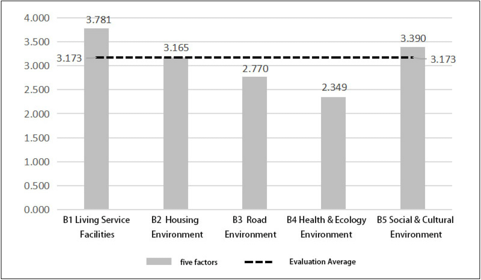이상의 분석 결과를 토대로 태남마을에 대한 전체만족도는 3.173으로 나타났으며, 평가 척도는 ‘보통’에 해당된다. 같은 방식으로 거주환경의 5개의 요인별 및 세부요인별 만족도를 산정하였다. Table 4과 같이 요인 B1의 지표 값이 3.781, 요인 B2의 지표값이 3.165, 요인 B3의 지표값이 2.770, 요인 B4의 지표값이 2.349, 요인 B5의 지표값이 3.390으로 나타났다.