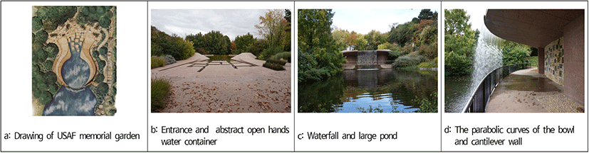 미국의 숲을 생각나게 하는 자생하는 숲에 둘러싸여 있으며, 이곳으로부터 대서양 해안의 돌이 깔린 초원을 암시하는 잔디밭으로 미군 병사의 전진을 상징하고 있다(Figure 4(a) 참조). 진입공간의 분홍색 화강석 포장 위에는 “우리 땅의 심장부에서 자유라는 이름으로 당신에게 주어진 우리 젊은이들의 피를 흘려보내라(FROM THE HEART OF OUR LAND FLOW THE BLOOD OF OUR YOUTH GIVEN TO YOU IN THE NAME OF FREEDOM)”는 기념적 텍스트를 새기어 자유를 위한 미국 젊은 군인들의 희생을 기리고(Figure 4(b) 참조), 밝은 분홍색 화강석으로 만들어진 열린 양손의 모습을 추상적으로 형상화한 수반(水盤)과 이곳을 가득 채워 가장자리로 흘러 넘쳐서 아래 못으로 떨어지도록 하였다(Figure 4(c) 참조). 수반의 구조물을 받치는 캔틸레버 벽에는 미국의 50개 주와 4개 영토에서 가져온 돌이 붙여져 있으며, 방문객은 수반 아래 벽으로 지나가는 보행로에서 수반을 흘러넘치는 물과 풀을 직접 볼 수 있도록 하였다(Figure 4(d) 참조). 추상적인 열린 양손의 형태로 만들어진 수조와 떨어지는 물을 통하여 희생된 젊은이의 생명과 자유를 추구하는 의미를 은유적으로 표현함으로써 기념정원으로서 가장 기본이 되는 희생자 추모에 중점을 두었으며, 미국 영토에서 가져온 돌을 사용하여 국가적 일체감을 강조하였다.