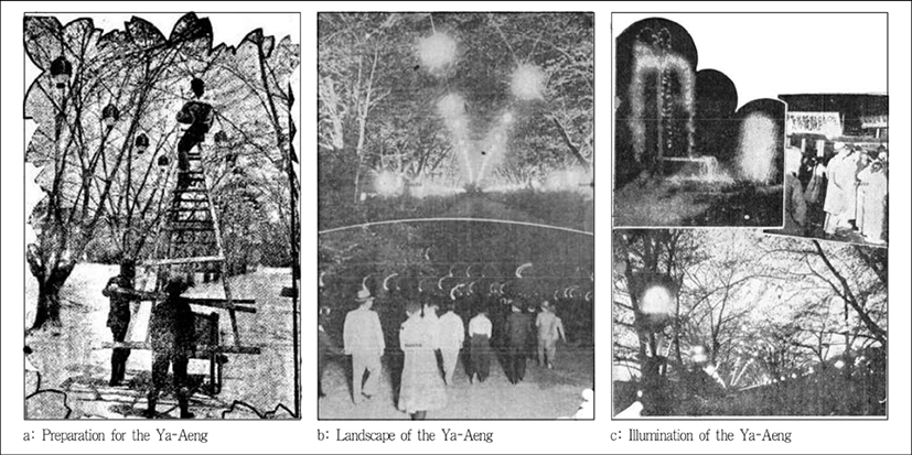 야앵의 경관은 상춘객의 수가 늘어나는 만큼 해가 갈수록 화려해진다. 매일신보에 따르면 창경원은 작년보다 더 많은 상춘객이 방문할 것을 예상해 “길을 넓히고 앉아서 쉴 수 있는 벤치를 조성하는 준비”를 하는가 하면 “만 명 이상의 상춘객을 수용하기 위해 동물원 일부를 옮기고 큰 마당을 만들 계획7)”이었다. 또한, 같은 기사에는 야앵 경관을 작년보다 화려하게 만들기 위해 준비하는 모습이 기록되어 있는데, 해마다 200주씩 보식하던 벚나무를 400주로 늘려 심었으며, 나무 위에는 강촉전등(絳燭電燈)을 달아 작년보다 한층 불야성(不夜城)을 만들고자 계획을 세운다(Figure 6 참조). 야앵의 현란한 전등 장식은 관앵에서는 볼 수 없는 창경원의 또 다른 경관을 만들어낸다.