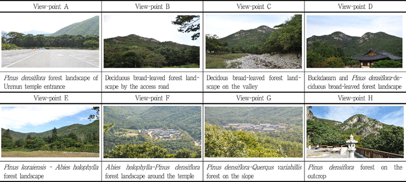 청도군 운문사 문화경관림 특성을 파악하기 위해 운문사를 바라보는 경관과 운문사에서 바라보는 경관으로 두 가지 관점에서 식생경관을 분석하였다. 분석결과, 경관조망점 A, B, C, D, E는 운문사에서 바라본 경관이며, F, G, H는 운문사를 바라보는 경관조망점(Figure 2 참조)으로 조망점 A 경관은 근린생활시설 주변의 수구막이 소나무숲경관으로 이곳에서 가장 양호한 문화경관림 중 하나이며, B 경관은 수구막이 소나무림과 연결되다가 갑자기 나타난 개활지로 호거산 능선부의 소나무경관과도 단절되어 있어 소나무경관 회복이 필요한 곳이었고, C 경관은 하천변의 낙엽활엽수와 소나무림이 혼효되어 있는 단풍경관이 우수한 소나무-낙엽활엽수 경관이었으며, D 경관은 북대암을 바라본 경관으로 정상부근의 병풍바위와 소나무림 경관이 우수하였다. 조망점 F 경관은 운문사를 바라보는 경관으로 운문사, 운문천, 사찰을 둘러싸고 있는 1차 경계림의 낙엽활엽수, 2차 경계림인 전나무림과 소나무림경관이었으며, G 경관은 사면의 소나무림에 굴참나무가 부분적으로 혼효되어 있는 경관이었으며, H경관은 호거산 사면의 소나무림 경관이었다(Table 1 참조).