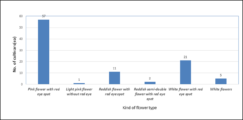 품종보호권을 획득한 품종들의 꽃의 종류는 대부분 홑꽃 품종이었으며, 반겹꽃 품종은 2품종, 겹꽃 품종은 전혀 없는 것으로 나타나 홑꽃 품종이 주를 이루고 있었다(Figure 2 참조). 꽃색의 경우, 꽃잎이 분홍으로 단심이 있는 품종이 57품종으로 가장 많았으며, 흰색 꽃잎에 단심이 있는 품종이 21품종으로 많았다. 그러나 꽃잎이 적색이고 단심이 있는 품종이 11개로 나타나, 기존의 무궁화 품종에 비해 꽃색이 다양화 되는 것을 알 수 있었다.