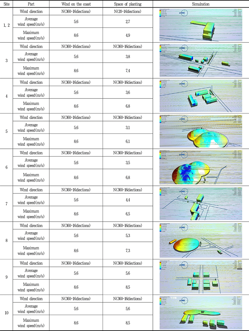 겨울철 최저온도에도 건축물, 산림 등 위요에 의한 상록활엽수에 도달 풍속이 어느 정도 완화되는지 시뮬레이션을 통해 분석하였다(Table 5 참조).
