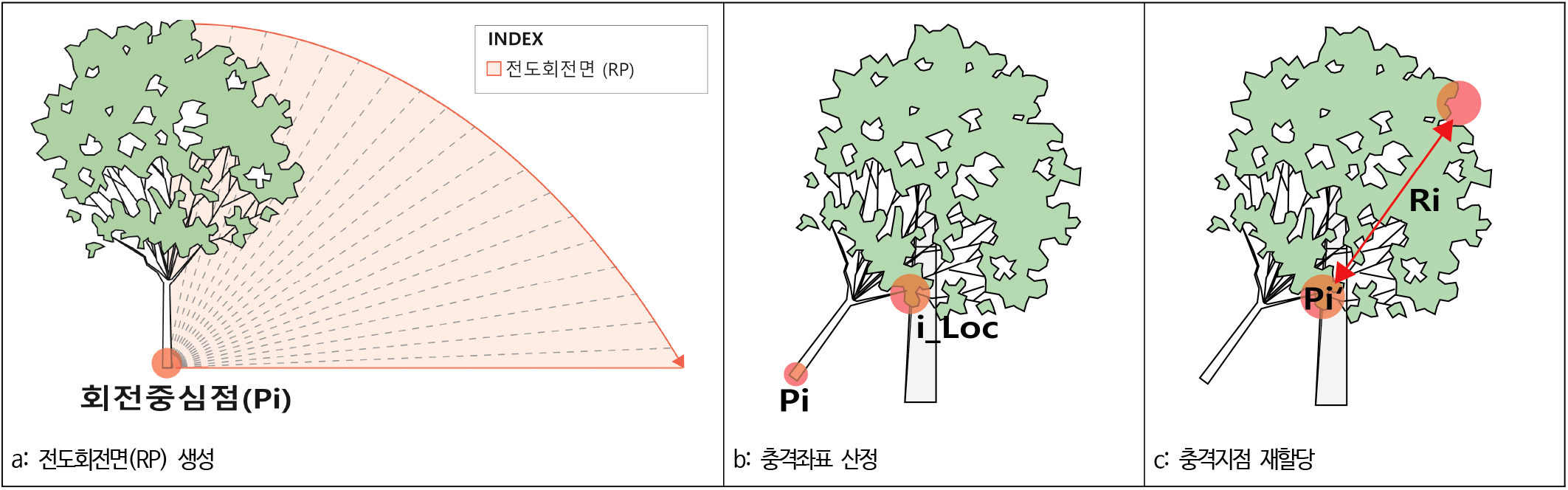 충격량은 Eq. 9를 활용하여 그림 6의 과정을 반복 수행하여 산출하였다. 산출 수목을 대상으로 건물, 지형과의 충돌 여부를 파악하고, 전도회전면(RP)을 생성하여 가장 먼저 충돌이 발생하는 지점을 도출하였다(그림 7(a) 참조). 전도회전면(RP)은 도복이 진행되는 방향에서 수직의 회전면을 1° 간격으로 발생시킨 것이다. 위험범위 내 1°간격으로 생성한 수평의 전도선(L)을 기준으로 직립하여 생육하는 수목은 360개, 기울어져 생육하는 수목은 180개의 전도회전면(RP)을 생성하였다. 충격량은 생성된 전도회전면(RP)을 활용하여 산출하였다. 수목과 피해대상의 충돌 발생 시 수목이 피해대상을 타격한 충격좌표(i_Loc)와 충격지점의 각도를 도출하고, 충격거리(i_dist)를 산출하였다(그림 7(b) 참조). 충격거리(i_dist)는 회전중심점(Pi)과 충격좌표(i_Loc) 간의 거리이다. 이때, 수고(H)보다 충격거리(i_dist)가 짧은 경우, 수고에서 충격거리를 제외한 부분(Ri= H – i_dist)에 대하여 n차 충격이 발생할 수 있다. n차 충격이 발생할 경우 충격좌표, 충격량을 계산할 수 있도록 변수에 재할당하였다(그림 7(c) 참조). 충격거리를 누적하여 수고보다 커지기 전까지 반복 산출하였다(그림 8 참조).