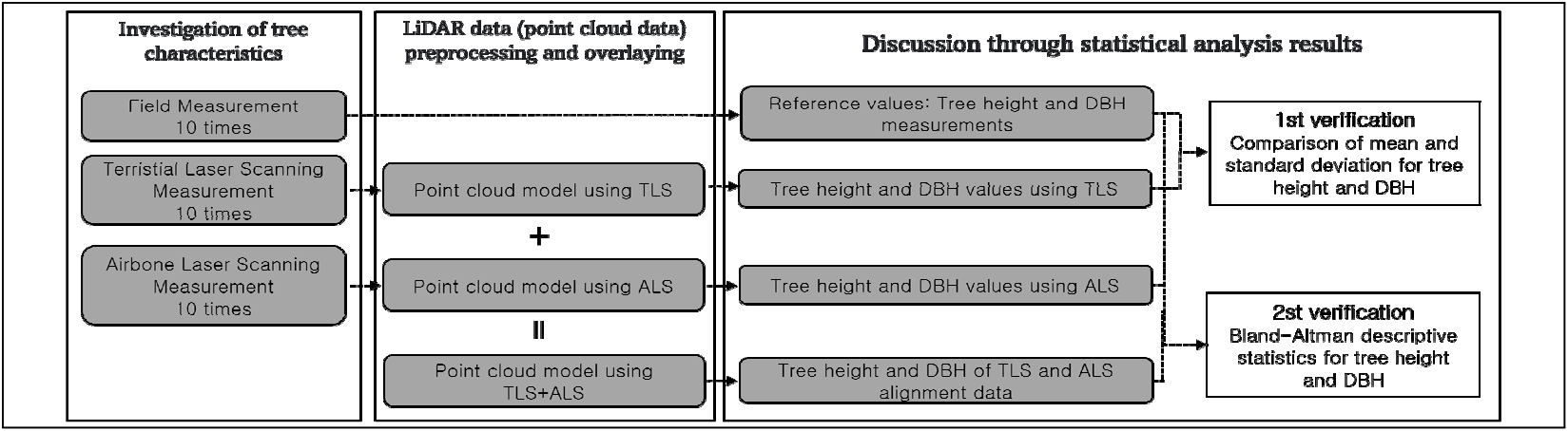 본 연구는 고정밀 측량기술인 라이다(LiDAR)를 활용하여 수목 재적 측정에 대한 객관성 및 정확성 향상과 일관성 있는 데이터 취득이 가능하도록 정량적으로 검증하고자 하였다. 이에 현장조사를 실시하여 수목의 수고 및 흉고직경을 측정하고, 지상라이다(terristial laser scanning, TLS)와 드론라이다(airborne laser scanning, ALS)를 활용하여 각 측정 방법에 따른 결과에 대한 비교 검증을 실시하였다.